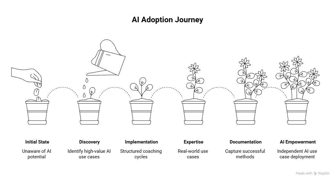 Your team confidently identifies and deploys AI use cases without you. They've moved from "AI exists" to "here's what we're doing next" and they have the methodology to keep improving.